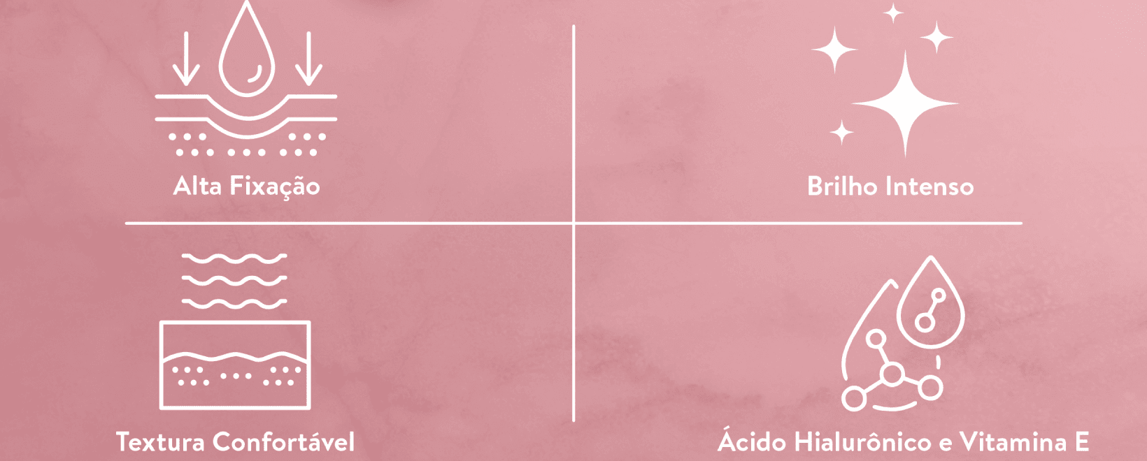 Os glosses, possuem alta pigmentação, textura confortável, sem o aspecto pegajoso, além de conter vitamina E que garante hidratação aos lábios, disponíveis em 7 cores.